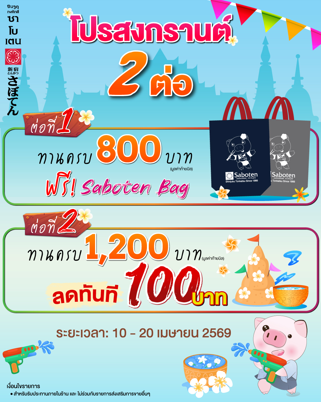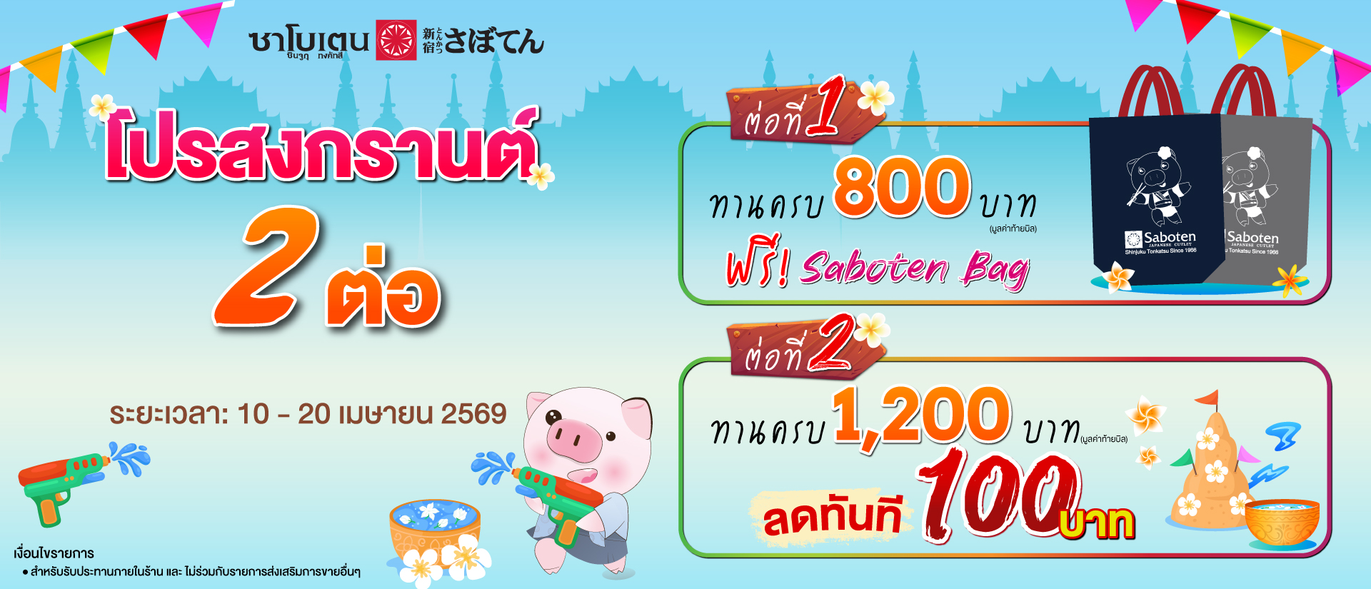 Menu เมนูร้านซาโบเตน Branch ร้านซาโบเตนสาขาใกล้คุณ Saboten - Central World 3 , 3 fl. Saboten - Central Rama 9 7 fl. Saboten - The Promenade , 2 fl. Saboten - J-Park Saboten - Terminal 21 Rama 3 1 fl. Saboten - Central Pinklao , G fl. Saboten - Central Pattaya , 5 fl. Contacts Delivery เลือกสาขาใกล้คุณ แล้วสั่งผ่านลิงก์ด้านล่างเลย! Saboten Central Grand Rama 9 สั่งผ่าน Delivery Saboten Central World สั่งผ่าน Delivery Saboten The Promenade สั่งผ่าน Delivery Saboten J-PARK Sriracha สั่งผ่าน Delivery Saboten Terminal 21 Rama 3 สั่งผ่าน Delivery Saboten Central Pinklao สั่งผ่าน Delivery Saboten Central Pattaya สั่งผ่าน Delivery ข้อมูลสำนักงานใหญ่ บริษัท เพรซิเดนท์ กรีน เฮ้าส์ ฟู้ดส์ จำกัด สำนักงานใหญ่ 121/49 ชั้น 11 อาคารอาร์เอส ทาวเวอร์ ถนนรัชดาภิเษก แขวงดินแดง เขตดินแดง กรุงเทพมหานคร 10400 How to eat คำแนะนำในการทาน Tonkatsu sauce เตรียมซอสทงคัตสึ Step 1 | Grind sesame ใช้ไม้ที่มากับถ้วย บดงาคั่วในถ้วยประมาณ 4-5 ครั้ง หรือตามความชอบ เพราะยิ่งบด ก็จะยิ่งหอมกลิ่นงา Step 2 | Tonkatsu sauce น้ำซอสในโถสีเทา เป็นตัวแปรสำคัญที่จะช่วยให้หมูทอดทงคัตสึอร่อยขึ้น ซอสสูตรพิเศษเฉพาะซาโบเตน Step 3 | Mixed จากนั้นตักน้ำซอสใส่ถ้วยงา 3 ช้อนกำลังดี แล้วคนงาคั่วและน้ำซอสให้เข้ากัน จากนั้นก็ได้เวลาอร่อยกับทงคัทสึที่รอคอย Cabbage Salad สลัดกะหล่ำปลี Cabbage กะหล่ำปลีปลอดสาร สดกรอบ ทานสดได้อย่างปลอดภัย หั่นเป็นชิ้นบาง ๆ ฝอยละเอียด แช่เย็นฉ่ำชื่นใจทานคู่กับน้ำสลัด 2 ชนิด Kaori Goma สลัดงา รสชาติหวานกลมกล่อม ด้วยเนื้องาและมายองเนส หอมกลิ่นงาคั่ว Yuzu Shoyu สลัดส้มยูสุ ได้รสชาติเข้มข้นจากโชยุ แล้วออกอมเปรี้ยวหน่อย ๆ จากส้มยูสุ About Japan เรื่องราวความรู้เกี่ยวกับญี่ปุ่น July 1, 2025 ย้อนเวลาสู่ยุคเฮอัน ไปพบกับ ‘องเมียวจิ’ ผู้หยั่งรู้ดวงดาว ปัดเป่าวิญญาณร้าย และคอยชี้นำชะตาของแผ่นดิน May 22, 2025 เคยสงสัยไหมว่า ‘ฮานะฟุดะ’ ไพ่ลายดอกไม้สวย ๆ ของญี่ปุ่นที่เห็นตามหนังหรือการ์ตูนคืออะไร? April 21, 2025 มาแล้ว !! พยากรณ์ซากุระบานทั่วญี่ปุ่นประจำปี 2025 March 18, 2025 นินจา นักรบเงาผู้ลึกลับที่เต็มไปด้วยเรื่องเล่าและตำนาน แต่ความจริงแล้วพวกเขาเป็นใครกันแน่ ? February 6, 2025 เซ็ตสึบุน เทศกาลแห่งความสุข ปาถั่ว ปัดเป่าสิ่งชั่วร้าย รับโชคดี เสริมสิริมงคล January 16, 2025 เตรียมตัวให้พร้อม กับ 6 สวนสนุกในญี่ปุ่นที่สายเที่ยวห้ามพลาด! January 7, 2025 ทำไมชาวญี่ปุ่นถึงให้ความสำคัญกับฝันแรกของปี ? December 12, 2024 หมู่บ้านสุนัขจิ้งจอกซาโอะ สำหรับทาสรักสุนัขจิ้งจอกตัวน้อยต้องไม่พลาด October 31, 2024 ร่วมเดินทางข้ามกาลเวลาไปสู่โลกแห่งวิญญาณ กับตำนาน 3 วิญญาณอาฆาตผู้ยิ่งใหญ่แห่งญี่ปุ่น September 30, 2024 เปิดโลกแห่งตำนาน กับเรื่องราวของเทพเจ้าแห่งการสรรค์สร้าง ผู้ให้กำเนิดญี่ปุ่น September 9, 2024 7 เครื่องรางจากญี่ปุ่น สำรับสายมูที่จะมาช่วยเปลี่ยนชีวิตให้ปัง August 29, 2024 เซฟด่วน ถ้าไม่อยากพลาดชมใบไม้เปลี่ยนสีที่ประเทศญี่ปุ่นในปี 2024 นี้ Augu